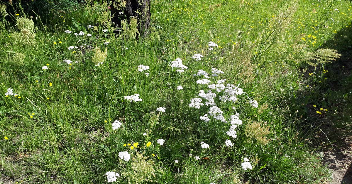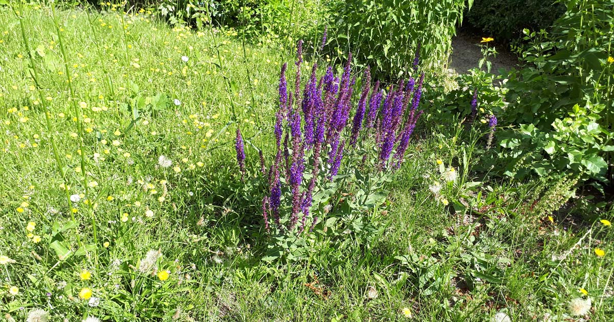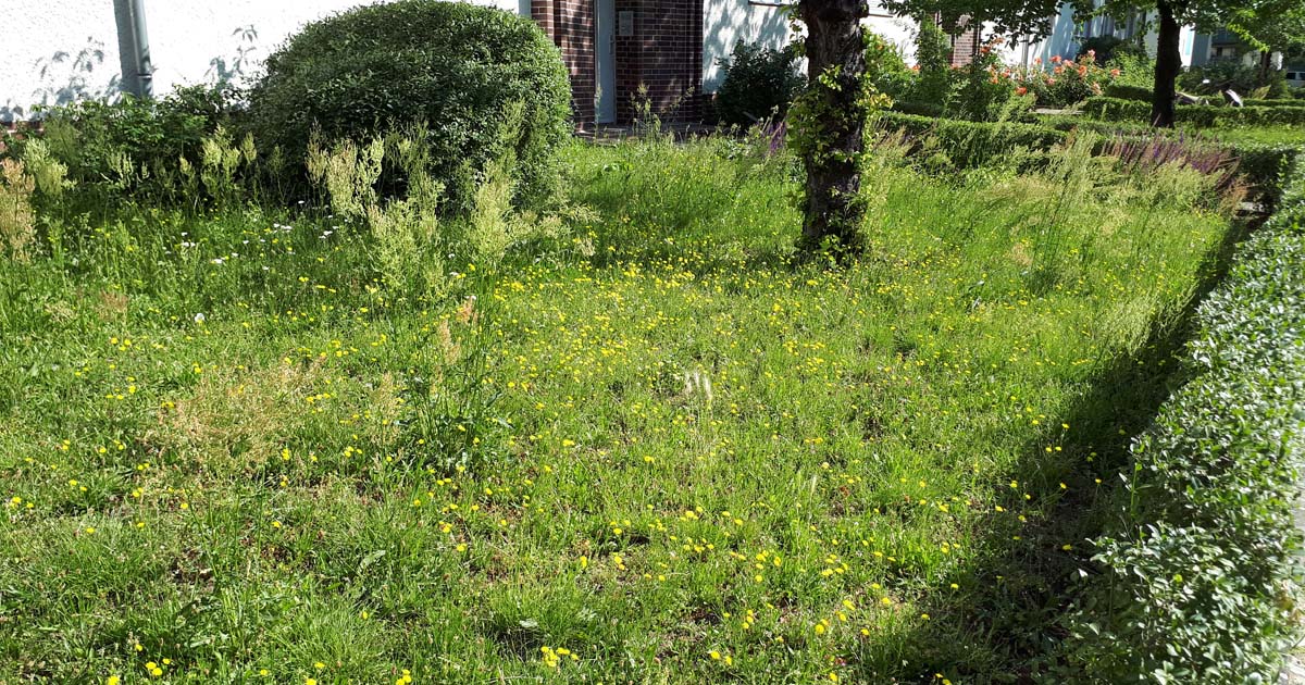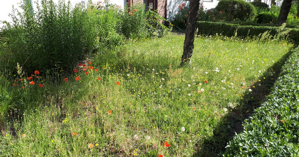 Wir wohnen hier in Lankwitz in einem Wohnblock der Covivio, und auf deer anderen Straßenseite hoppelt auf einer großen Rasenfläche die angeheuerte Gartenlandschaftsbau-Firma mit einem dicken Aufsitzmäher über eine Wiese. Nicht besonders vielfältig aber auch nicht uninteressant für Bestäuber, da überall zwischendurch Wildkräuter blühen.