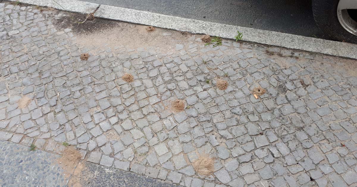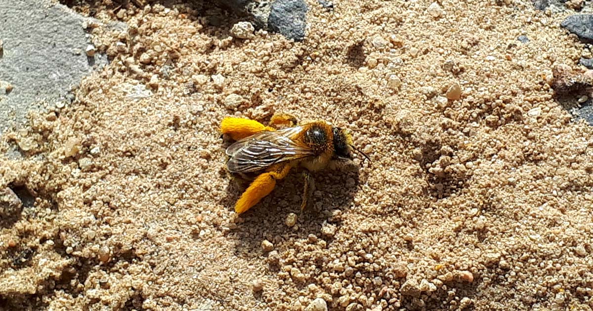 Es geht aber eben auch anders, wenn man sich mal die Mühe macht mit den Mitarbeitern einer Wohnungsbaugesellschaft zu sprechen. Genau das tat ich auch auf die Bitte einer Dame hin, die in der Havensteinstraße wohnt. Denn dort nistet seit Jahren die Braunbürstige Hosenbiene, eine Wildbiene, die auf den Gehwegen anhand der Sandhäufchen zu finden ist.